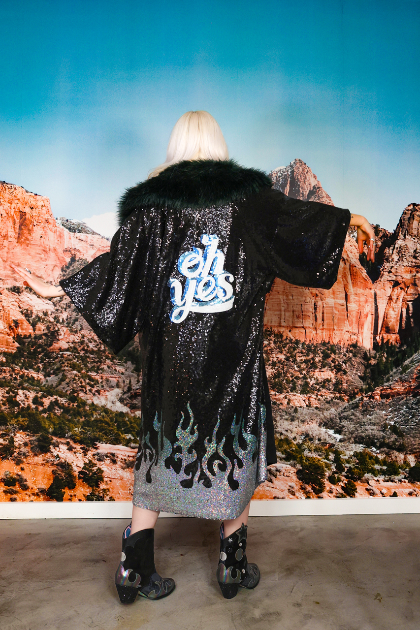 Step into the spotlight, darling—this ain’t your grandma’s duster. The Black Rocker Duster is for those who like their style with a side of hellfire. Jet-black and dripping with attitude, this coat sets the night ablaze with ombre sequin flames licking up from the hem like you just walked out of a backstage riot.