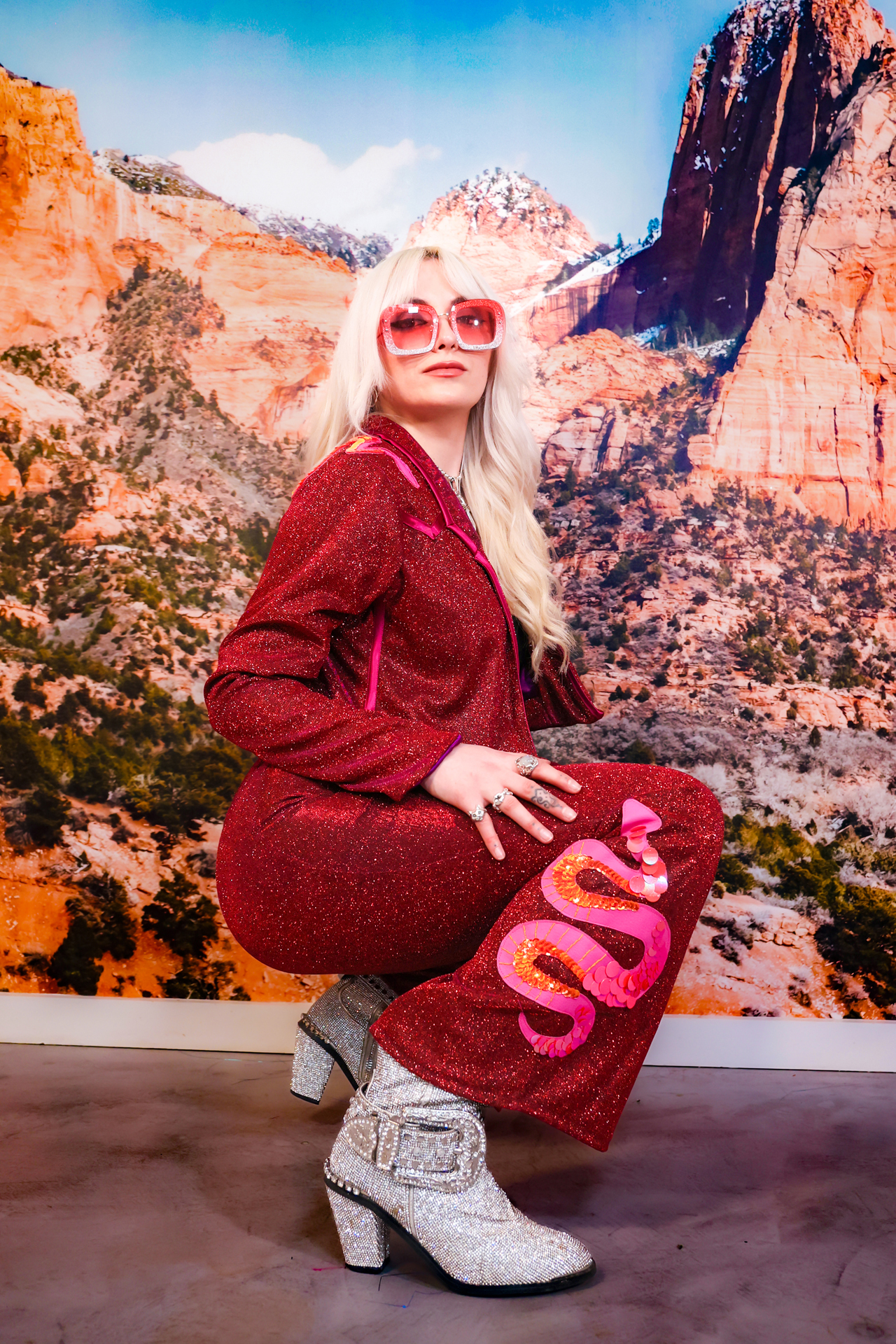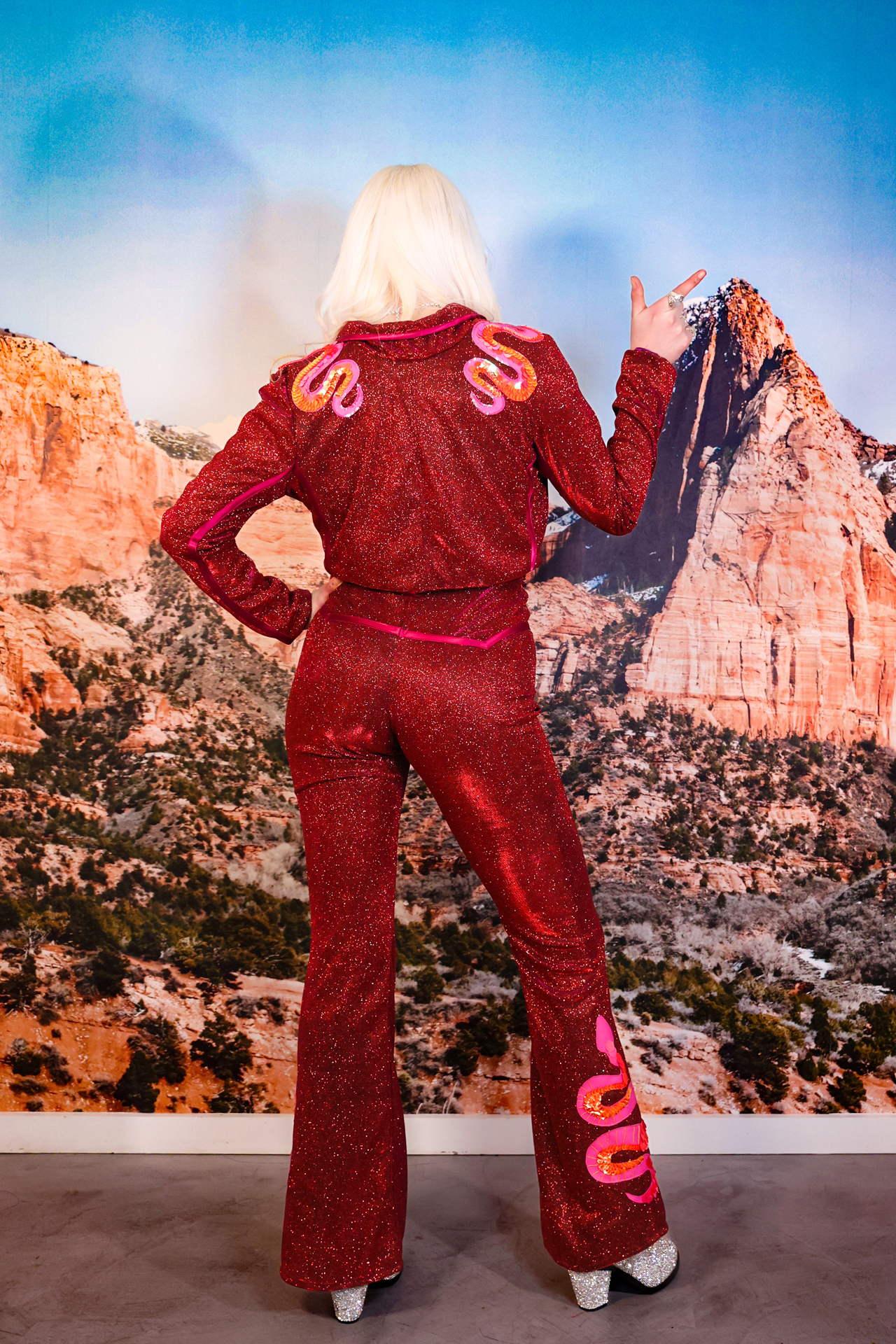 A glittering desert set in colour-shift burnt orange, edged with deep fuchsia satin trim. Sequined snakes slither down the legs and over the shoulders—because subtlety is for prey. Jacket is cropped and lined, flared pant is ultra high waist.