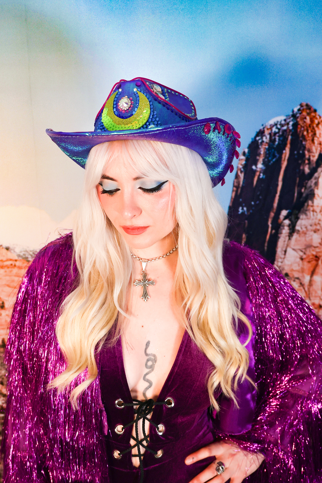 A luminous pink-purple tinsel tempest—every inch dripping in liquid fringe that moves like a glitter hurricane. Purple satin lining slithers beneath, because even vengeance deserves a velvet touch. Cropped to cut, brutal to ignore.