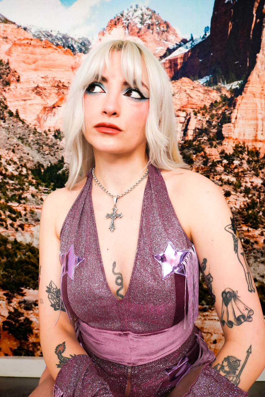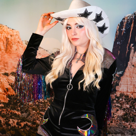 A mauve velvet and glitter colour-shift dreamscape — where prairie innocence collides with disco delirium. Halter top and shorts cut for sin, dripping lilac fringe from the bust, cuffs, and shorts like whispered secrets. Metallic pink stars cling to the bust and short fronts, because even cowgirls chart their own destiny.